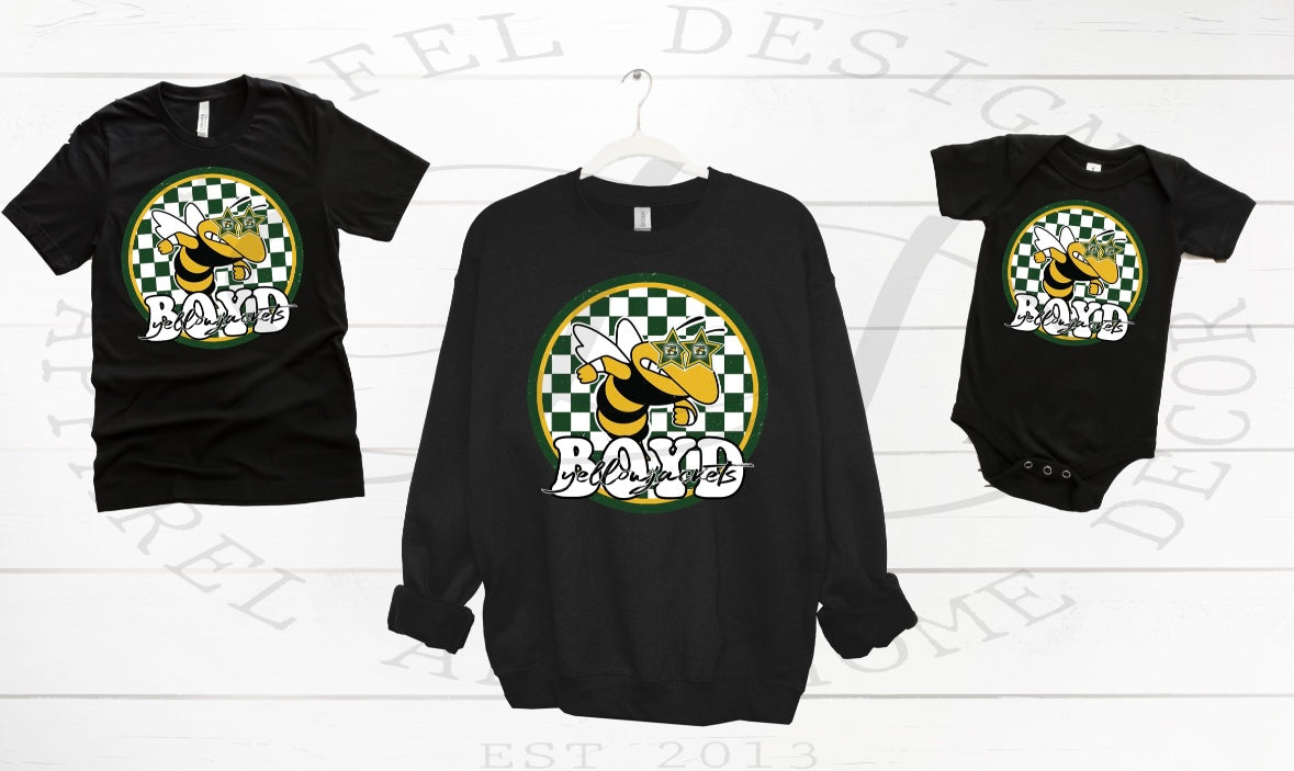 Infant Rabbit Skins onesie, Toddler Rabbit Skins, Youth Gildan Tee, Adult Gildan Tee, Adult Bella Crew Sweatshirts.