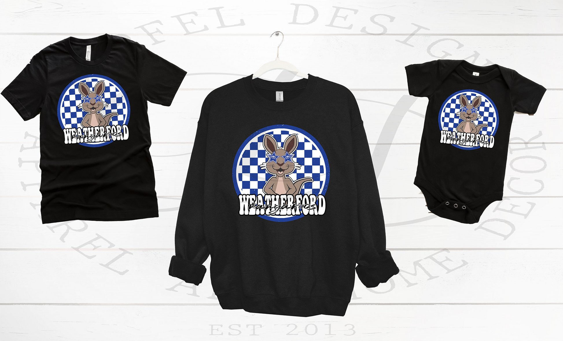 Infant Rabbit Skins onesie, Toddler Rabbit Skins, Youth Gildan Tee, Adult Gildan Tee, Adult Bella Crew Sweatshirts.